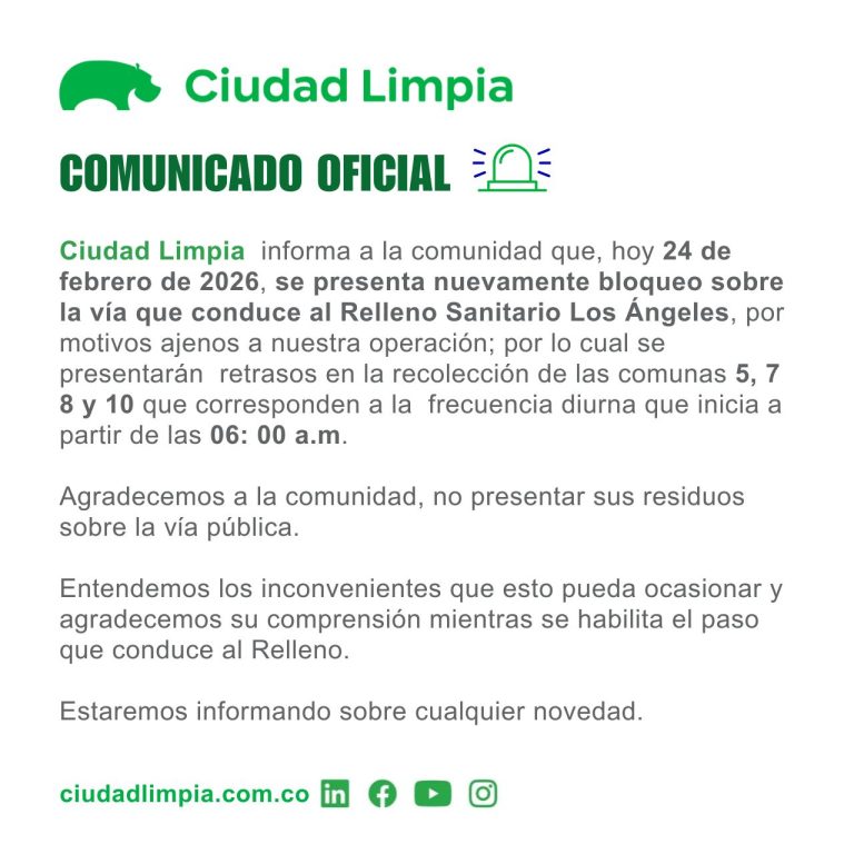 Ciudad Limpia informa a la comunidad que este 24 de febrero de 2026 se presenta nuevamente un bloqueo en la vía que conduce al Relleno Sanitario Los Ángeles, por motivos ajenos a nuestra operación.
