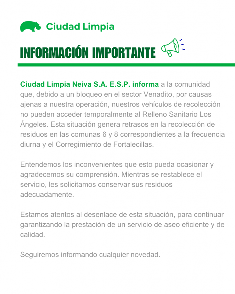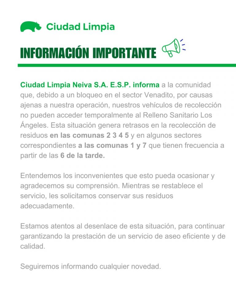 Ciudad Limpia informa bloqueo en el sector de Venadito