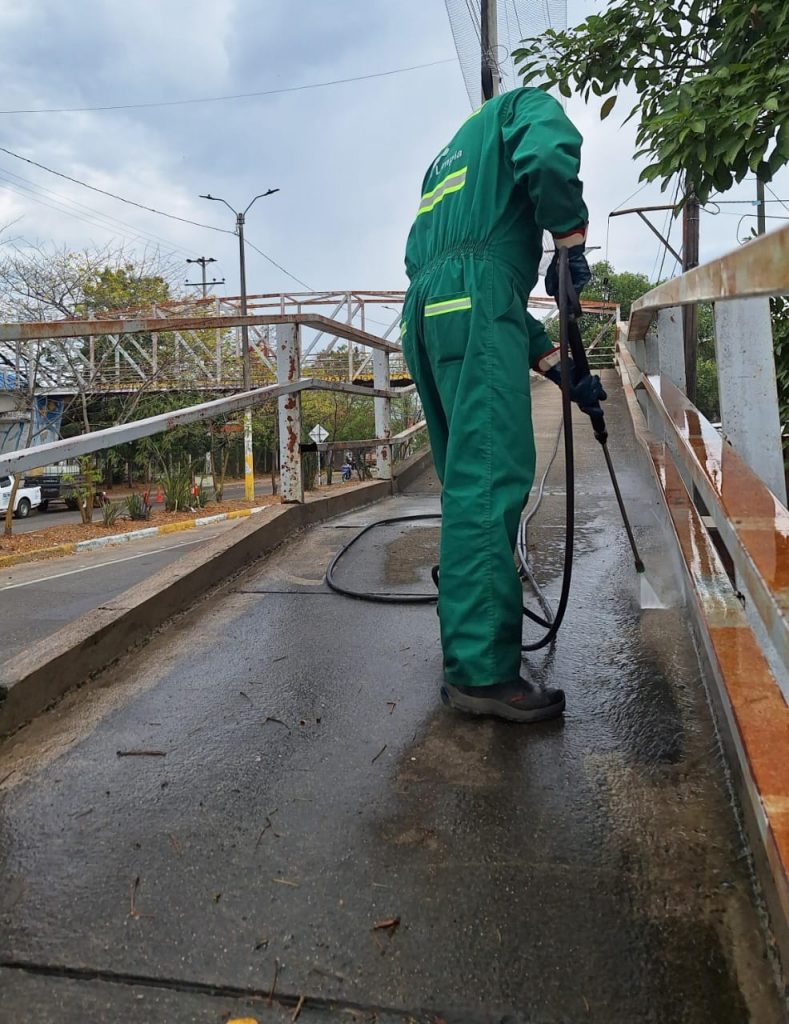 Ciudad Limpia continua trabajando bajo los lineamientos del PGIRS municipal, hoy a través de operativo especial de limpieza y lavado se interviene el puente peatonal de la Calle 84 con carrera 7-31 Av. Alberto Galindo.