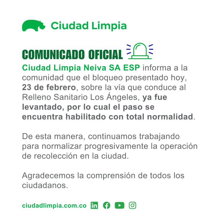 Informamos a la comunidad que fue levantado el bloqueo presentado sobre la vía que conduce al Relleno Sanitario Los Ángeles, restableciéndose el paso y la movilidad con normalidad.
