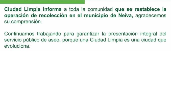 Se restablece la recolección de residuos en la Ciudad de Neiva